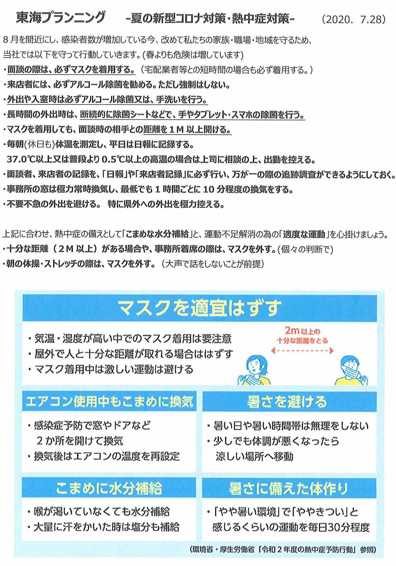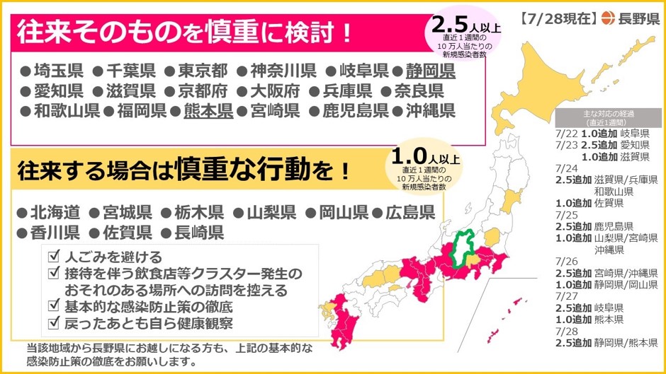 東海プランニング 夏の新型コロナ対策 活動情報 2020.07.282020.07.29 長野県でも、不要不急の県外への往来を避けるよう、情報が更新されています。 毎日の生活の中で、出来る限りの対策を、私たち皆で実践していきましょう。 2020年7月28日 村井