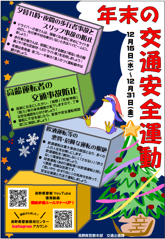 【毎日投稿】年末の交通安全運動【松井】 日常・つぶやき 2021.12.16 15日から31日まで、年末の交通安全運動が始まりました。 「信濃路は みんなの笑顔 つなぐ道」をスローガンに掲げております。 年末にかけて忙しい時期ですが、交通安全を意識していきましょう。 松井