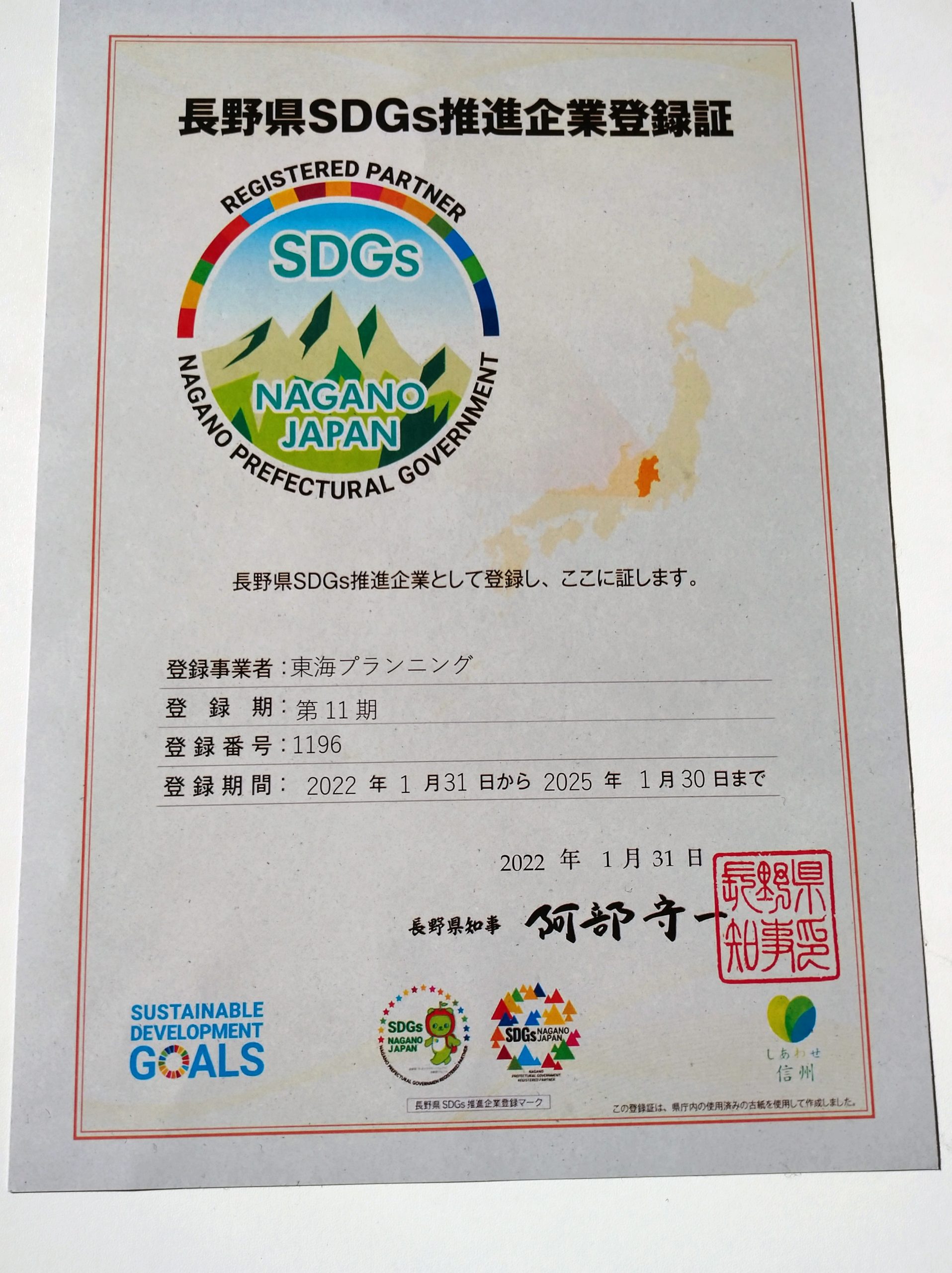 昨日我が社にも長野県SDGs推進企業登録証が県庁から届きました!