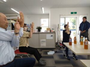 体組成測定の後は座ってできる柔軟などのストレッチです。